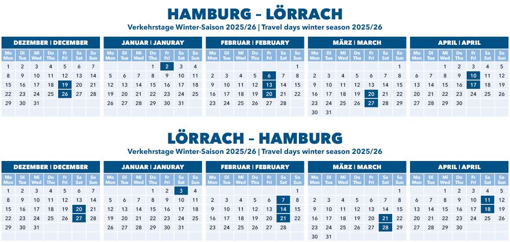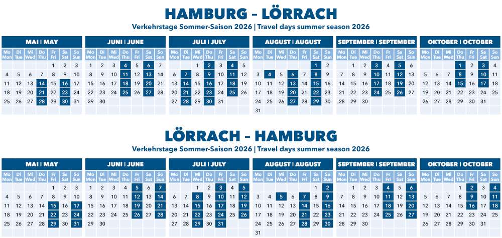 Lörrach → Freiburg → Hamburg (Dezember - April) Lörrach → Hamburg (Mai - Oktober) |
