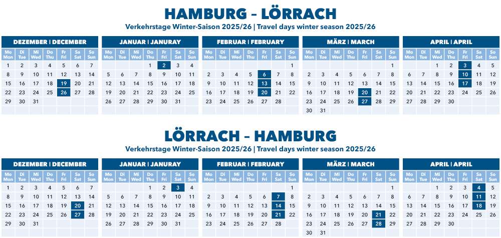In der WINTER-Saison 2025/2026 sind wir an 22 Verkehrstagen für Sie da.