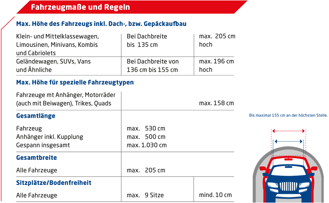 Fahrzeuge mit einer Dachbreite von mehr als 155 cm sind grundsätzlich vom Transport ausgeschlossen.